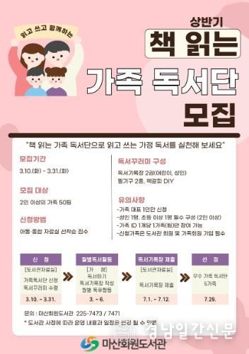 경남일간신문 | 창원시 마산회원도서관은 가족 독서문화 확산을 위해 ‘책 읽는 가족 독서단’을 운영하고 3월 10일 부터 3월 31일까지 상반기 참여 가족을 모집한다.