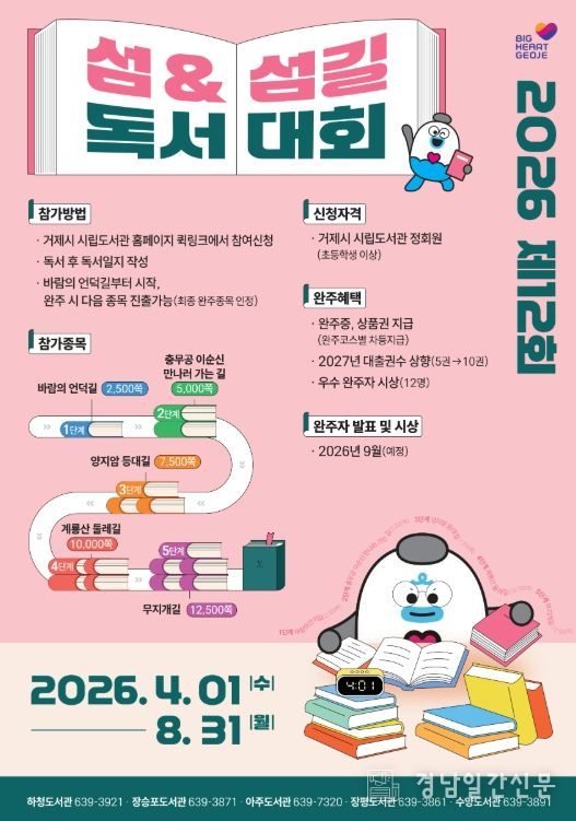 경남일간신문 | 거제시립도서관(하청·장승포·아주·옥포·장평·수양)은 거제시민의 독서 생활화와 책 읽는 문화를 조성하고자 오는 4월 1일부터 8월 31일까지 5개월간“제12회 거제시 섬·섬길 독서대회”를 개최한다고 밝혔다.
