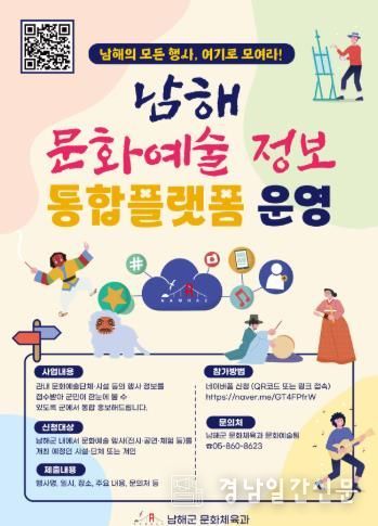 경남일간신문 | 남해군은 관내 문화예술 행사 정보를 한곳에서 확인할 수 있는 ‘남해 문화예술 정보 통합플랫폼’을 구축하고 본격 운영한다고 밝혔다.