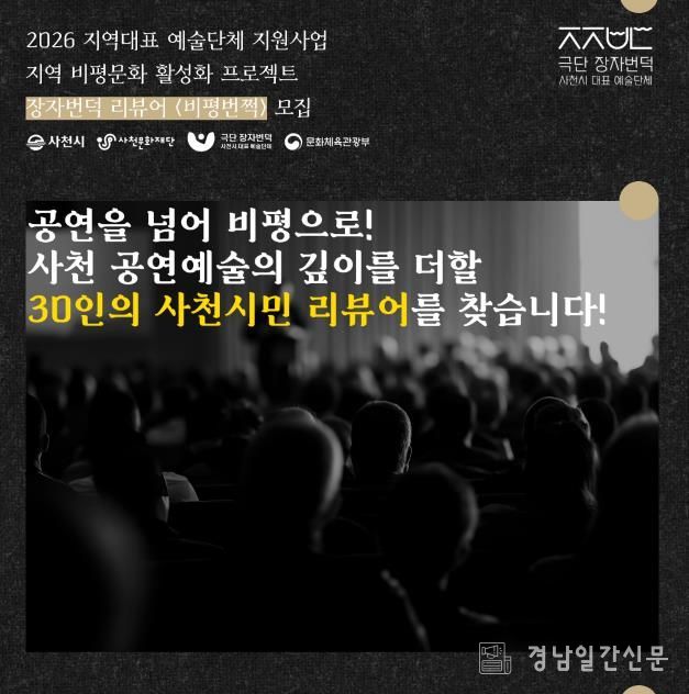 경남일간신문 | 사천시, 사천문화재단, 극단 장자번덕이 사천 공연예술의 깊이를 더할 시민 리뷰어 프로그램 '비평번쩍'에 참여할 사천 시민 30명을 오는 4월 3일까지 모집한다.