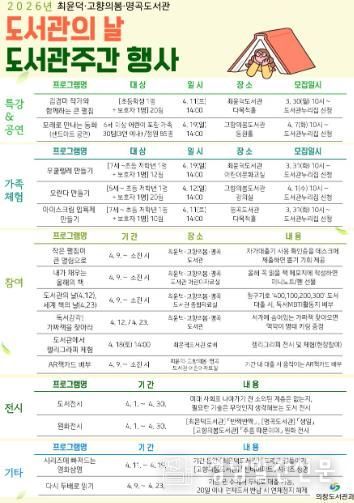 의창도서관과 김외화 과장은 “2026년 도서관의 날과 도서관주간을 맞아 시민들이 책과 더 가까워지고, 도서관이 즐겁고 유익한 문화 공간으로 자리잡는 기회가 되기를 바란다.”고 말했다.