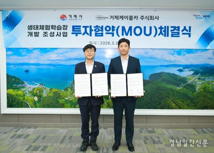 경남일간신문 | 거제시는 23일, 거제케이블카 주식회사와 지역 관광 활성화 및 생태교육 인프라 확충을 위한‘생태체험학습장 개발 조성사업’투자협약(MOU)를 체결했다.