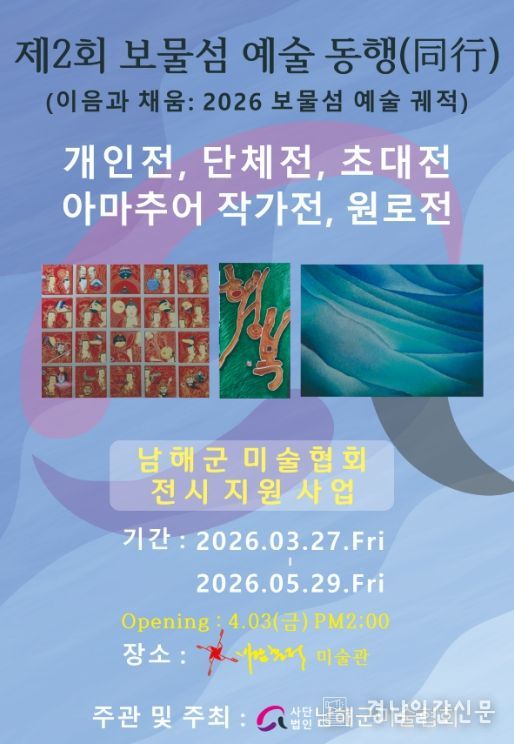경남일간신문 | (사)남해군미술협회는 오는 3월 27일부터 5월 29일까지 바람흔적 미술관에서 지역 예술인들의 창작 활동을 지원하고 군민들에게 풍성한 볼거리를 제공하기 위해 ‘제2회 보물섬 예술 동행’ 전시 지원사업을 개최한다.