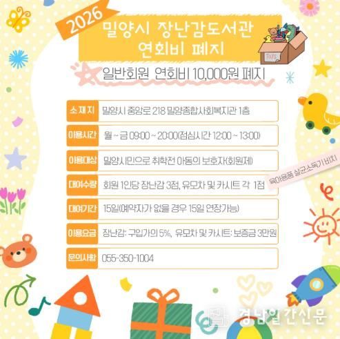 경남일간신문 | 경남 밀양시가 시민들의 육아 부담을 덜고 장난감도서관 이용을 활성화하기 위해 경남 시(市) 단위 지역 최초로 장난감도서관 연회비를 전면 폐지한다.