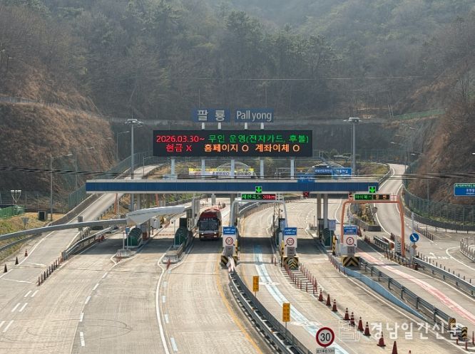 경남일간신문 | 창원특례시(시장 권한대행 장금용)는 오는 2026년 3월 30일부터 팔룡터널 통행료 수납 방식을 전면 무인시스템으로 전환한다고 밝혔다. 이번 변경은 터널 운영 효율성을 높이고 이용객에게 더욱 편리한 서비스를 제공하기 위해 추진됐다.