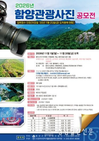 경남일간신문 | 함양군은 지역의 우수한 관광자원을 널리 알리고 새로운 관광 콘텐츠를 발굴하기 위해 ‘2026 함양관광 전국사진 공모전’을 개최한다고 밝혔다.