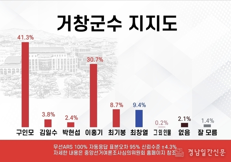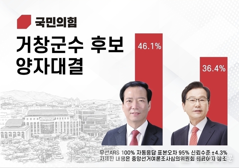 경남일간신문 | 6·3 지방선거 거창군수 선거전이 본격화된 가운데, 최근 실시된 여론조사에서 후보들 간의 지지율 격차가 크게 변화하며 판세가 요동치고 있는 것으로 나타났다.
