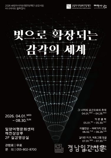 경남일간신문 | 밀양문화관광재단은 국립아시아문화전당재단이 주관한 ‘미디어아트 협력 전시’ 공모사업에 선정돼 오는 4월 1일부터 8월 30일까지 밀양여행문화센터 해천상상루에서 미디어아트 전시 ‘빛으로 확장되는 감각의 세계’를 개최한다.