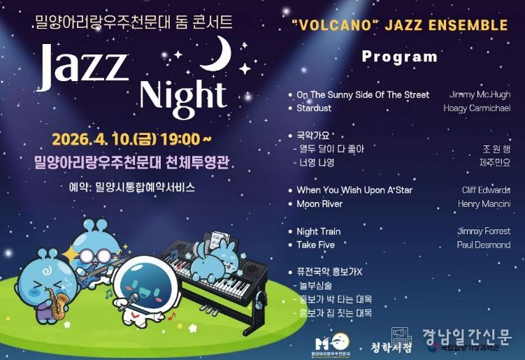 경남일간신문 | 밀양문화관광재단은 오는 4월 10일 밀양아리랑우주천문대 천체투영관에서 우주와 음악이 결합한 특별한 문화 행사 ‘재즈 나이트(Jazz Night)’를 개최한다.