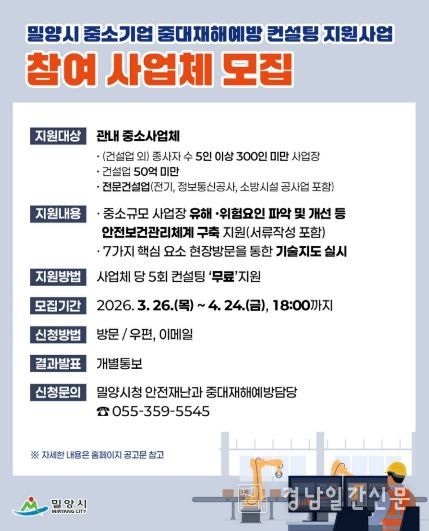 경남일간신문 | 경남 밀양시는 안전보건관리체계 구축에 어려움을 겪는 관내 중소기업을 대상으로 ‘2026년 밀양시 중대재해예방 컨설팅’ 사업을 추진한다고 밝혔다.