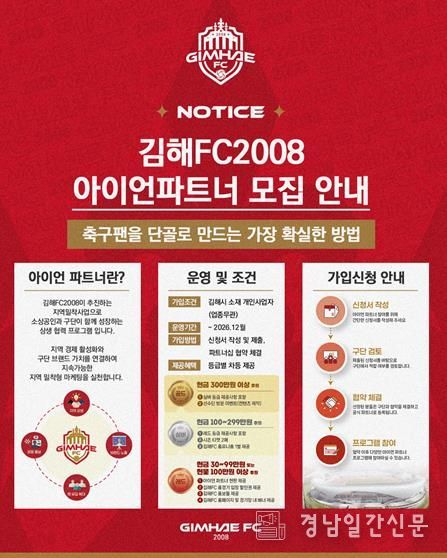 경남일간신문 | 김해FC2008이 지역 상생 및 경제 활성화를 위한 프로젝트의 일환으로 소상공인과 구단이 함께 성장하는 상생 협력 프로그램‘아이언 파트너’를 모집한다고 밝혔다.