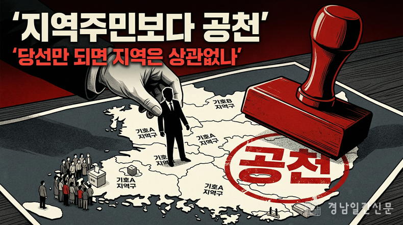 경남일간신문 | 지방선거를 앞두고 공천만 받으면 사실상 당선이 보장된다는 이른바 ‘공천=당선’ 인식이 지역 사회에서 도마 위에 오르고 있다. 여기에 지역 기반조차 부족한 ‘외지 후보’ 들까지 가세하면서 유권자들의 반발이 거세지고 있다.