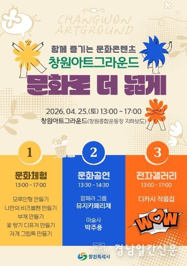 경남일간신문 | 창원특례시는 완연한 봄을 맞아 시민 누구나 일상에서 다채로운문화예술을 즐길 수 있는 '창원아트그라운드, 문화로 더 넓게' 행사를 오는 4월 25일 토요일 창원종합운동장 지하보도에서 개최한다고 밝혔다.