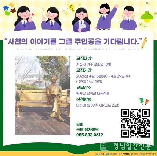 경남일간신문 | 사천시, 사천문인협회, 극단 장자번덕은 4월 29일까지 지역 청소년을 대상으로 문화예술교육 '내 마음의 삼천포, 박재삼을 그리다'의 참가자를 모집한다고 19일 밝혔다.