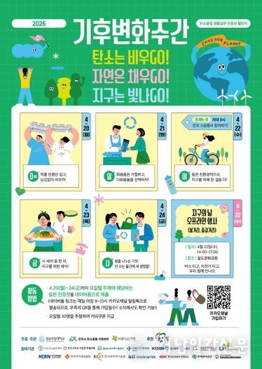 또한 ‘기후 동행 탄소중립 생활 실천 챌린지’는 20일부터 24일까지 카카오톡 채널을 이용한 온라인 실천 인증 캠페인으로 운영한다. 요일별로 다른 실천 주체를 정해 참여자들이 인증 숏을 공유하고, 추첨으로 모바일 쿠폰을 제공한다. 실천 주제는 ▲잔반 제로(Zero) ▲다회용품 사용 ▲친환경 이동 ▲소등 행사 참여 ▲채식 ▲물품 기부 등이다.