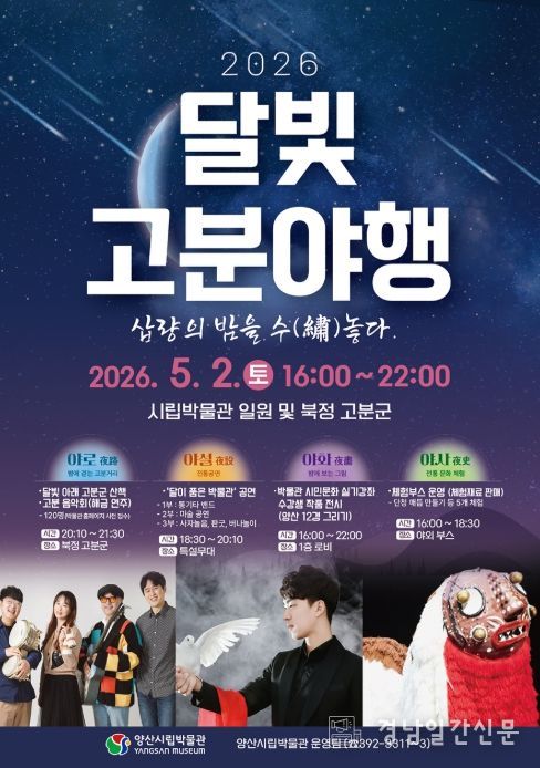 경남일간신문 | 양산시립박물관(관장 신용철)은 5월 2일 박물관과 북정 고분군(사적 제93호) 일대에서 ‘2026 달빛 고분 야행(夜行)’을 개최한다고 밝혔다.