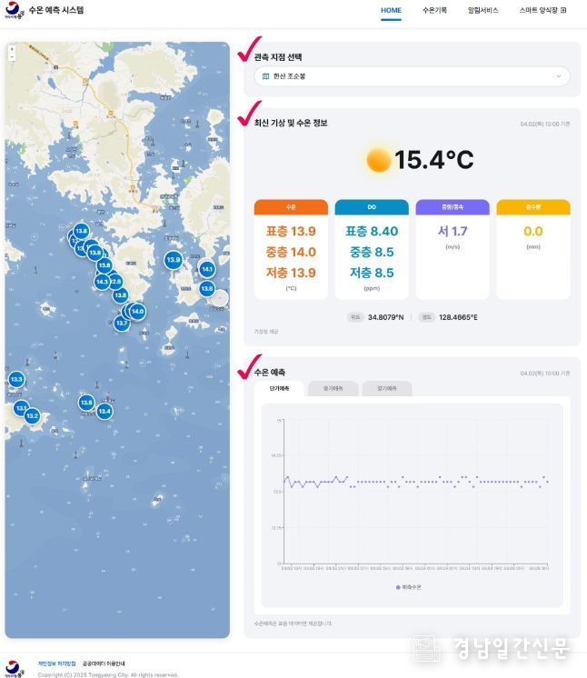 경남일간신문 | 통영시는 해양 기후변화에 따른 연안 재해 대응 강화를 위해 개발한 고수온 예측 서비스의 신청 접수를 지난 20일부터 시작했으며, 오는 5월부터 본격 운영에 들어간다.