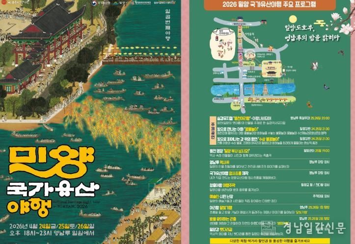 경남일간신문 | 경남 밀양시가 주최하고 밀양시문화도시센터가 주관하는 ‘2026 밀양 국가유산 야행’이 오는 4월 24일부터 26일까지 3일간 영남루 및 밀양관아, 밀양강 일원에서 펼쳐진다.