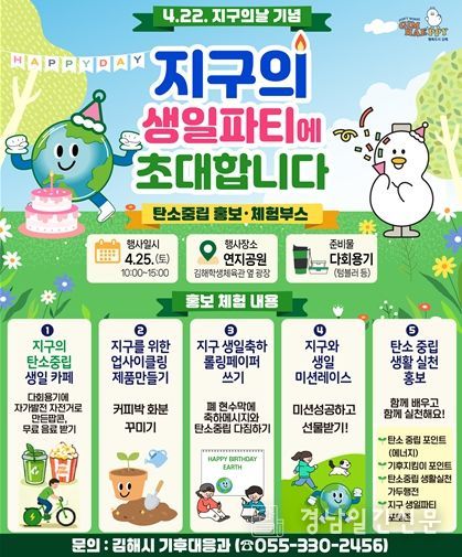 경남일간신문 | 김해시는 지구의 날(4.22)을 기념한 제18회 기후변화주간을 맞아 오는 25일 오전 10시부터 오후 3시까지 연지공원에서 탄소중립 체험 행사‘지구의 생일파티에 초대합니다’를 운영한다고 22일 밝혔다.