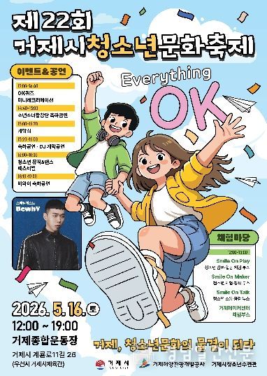 경남일간신문 | 거제시는 오는 2026년 5월 16일 12:00~19:00, 거제종합운동장(우천 시 거제시체육관)에서 제22회 거제시청소년문화축제 “Everything OK”를 개최한다.