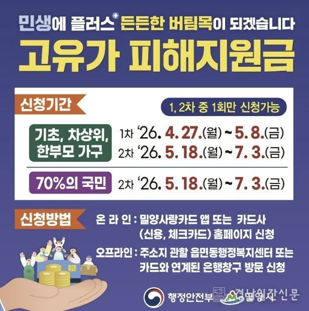 경남일간신문 | 경남 밀양시는 고유가로 인한 시민 부담 완화를 위해 4월 27일부터 7월 3일까지 ‘고유가 피해지원금’ 신청을 접수한다.