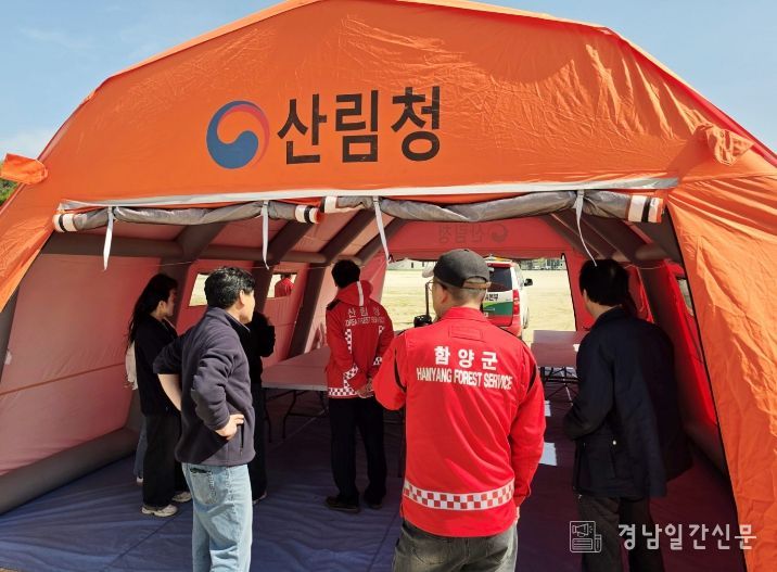 이번 훈련은 산불 발생 상황을 가정해 에어텐트와 지휘차를 설치·운영하며 현장 지휘 본부 운영체계를 점검하고, 유관기관 간 협력 대응 능력을 강화하기 위해 마련됐다.