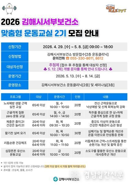 경남일간신문 | 김해시서부보건소에서 오는 29일부터 5월 8일까지 『2026년 맞춤형 운동교실 2기』 신규 참여자를 모집한다.