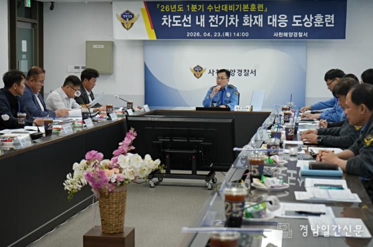 경남일간신문 | 사천해양경찰서는 23일 도선 내 전기차 화재 상황을 대비하여 선제적 해양사고 예방과 신속한 구조 대응체계 확립을 위한 수난대비기본훈련을 실시했다고 밝혔다.