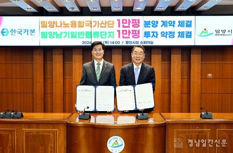 경남일간신문 | 경남 밀양시는 23일 시청 소회의실에서 ㈜한국카본, 한국토지주택공사 경남지역본부와 함께 ‘밀양나노융합국가산업단지 부지분양 계약 및 밀양남기일반물류단지 투자약정’을 체결했다.