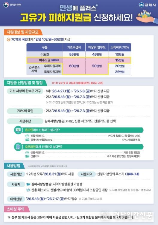 경남일간신문 | 김해시는 정부의 고유가 피해지원금 지급 사업에 따라 오는 27일부터 7월 3일까지 1차, 2차로 나눠 전 시민의 70%를 대상으로 지급한다고 23일 밝혔다.