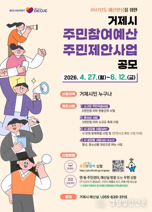 경남일간신문 | 거제시는 2027년도 본예산 편성을 앞두고 재정운용의 투명성과 시민에게 공감받는 예산편성을 실현하고자 오는 6월 12일까지‘주민참여예산 제안사업 공모’를 실시한다.