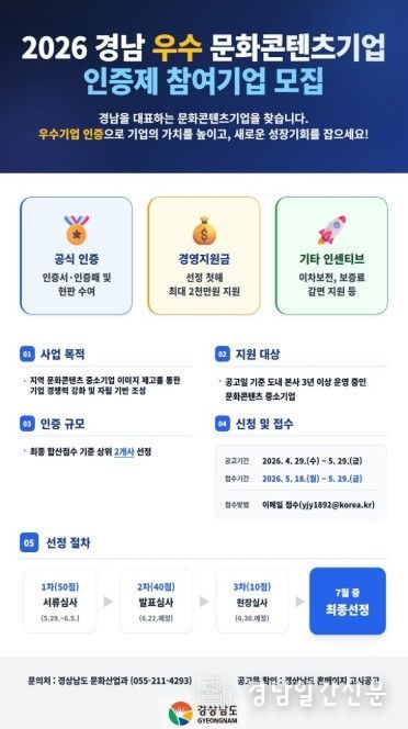 경남일간신문 | 경상남도는 ‘2026년 경남 우수 문화콘텐츠기업 인증제’ 참여 기업을 4월 29일부터 5월 29일까지 한 달간 모집한다고 밝혔다.