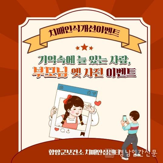 경남일간신문 | 함양군 치매안심센터는 5월 가정의 달을 맞아 부모님의 옛 추억이 담긴 사진을 통해 감사의 마음을 전하고, 치매 예방의 중요성을 알리기 위해 ‘부모님 옛 사진 인증샷 이벤트’를 비대면으로 운영한다고 밝혔다.