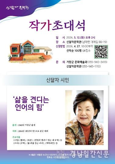 한편, 신달자문학관 ‘작가초대석’은 국내 주요 문인을 초청해 작품 세계와 삶의 이야기를 직접 들을 수 있는 문학 프로그램으로, 매월 1회 운영될 예정이다. 오는 6월에는 정호승 시인, 7월에는 신달자 시인, 8월에는 나태주 시인이 강연을 진행할 예정이다. 강연 관련 문의는 거창군 문화예술과 또는 신달자문학관으로 하면 된다.