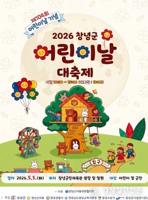 경남일간신문 | 창녕군아동위원협의회는 오는 5월 5일 제104회 어린이날을 맞아 지역 어린이와 가족이 함께 즐길 수 있는 ‘2026년 창녕군 어린이날 대축제’를 창녕군민체육관 광장에서 개최한다고 밝혔다.
