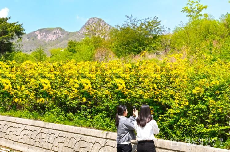 경남일간신문 | 29일 산청군 황매산 정상이 바라보이는 차황면 황매산로에 황매화가 만개해 방문객들의 눈길을 끈다.