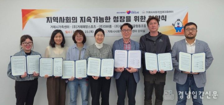 센터는 이날 거제시사회적경제지원센터에서 사회적기업 ㈜거제해양스포츠를 비롯해 ㈜더바름, 예비사회적기업 ㈜우리는, 밍글협동조합, 카페잠언 등 총 6개 기관과 업무협약을 체결했다.