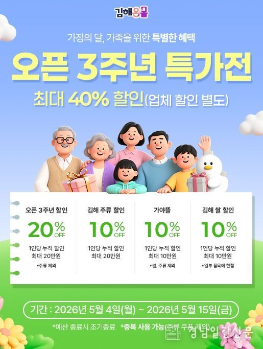 경남일간신문 | 김해의생명·산업진흥원은 김해시 통합 온라인 쇼핑몰 ‘김해온몰’ 오픈 3주년과 5월 가정의 달을 맞아 파격 특가전을 진행한다고 밝혔다.