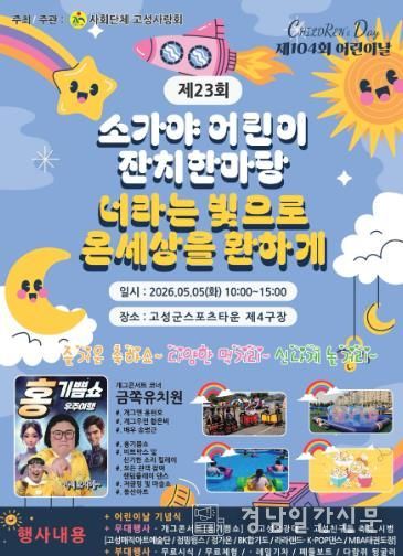 경남일간신문 | 고성군은 제104회 어린이날을 맞아 ‘너라는 빛으로 온 세상을 환하게’를 슬로건으로, 오는 5월 5일 오전 10시 스포츠타운 4구장에서 ‘제104회 어린이날 행사 및 제23회 소가야어린이 잔치 한마당’을 개최한다고 밝혔다.