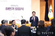 경남일간신문 | 경상남도는 23일 도청 도정회의실에서 2025년도 하반기 퇴임식을 개최하고 오랜 기간 도정 발전에 헌신한 공직자들의 영예로운 퇴임을 기념했다. 이 자리에는 박완수 도지사, 퇴직공무원과 가족, 노동조합 및 동료 직원 등 120여 명이 참석해 퇴직자들의 노고를 격려하고 새로운 앞날을 응원했다. 행사는 식전 공연을 시작으로 공로패·감사패 수여, 퇴직자들의 소회와 동료 직원들의 응원을 담은 영상 시청, 후배 직원들의 축가 등으로 진행됐다. 퇴직자들은 소감을 통해 그간 묵묵히 지지해 준 가족에게 감사를 전하고, 함께 근무한 후배 공직자들에게는 경남 발전을 위해 계속 정진해 달라는 당부의 말을 건넸다. 박완수 도지사는 축사를 통해 “30년 이상 공직에 몸담으며 도민을 위해 헌신해 오신 여러분의 노고에 도민을 대표해 진심으로 감사드린다”며 “여러분이 남긴 발자취와 노력은 경남 도정의 역사로 남아 후배 공직자들에게 오래 기억될 것”이라고 말했다. 이어 “여러분의 헌신 뒤에는 늘 묵묵히 지지해 준 가족의 희생과 헌신이 있었다”며 “특히 바쁜 공직 생활 속에서도 가정을 지켜온 가족들에게도 깊은 감사의