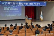 경남일간신문 | 경남 밀양시는 지난 28일 경남교육청 진로교육원 강당에서 전국밀양향우연합회 주최로 ‘지역경제 활성화 세미나’가 열렸다고 밝혔다. 이번 세미나는 안병구 밀양시장, 허홍 밀양시의회 의장, 현영희 전국밀양향우연합회 회장을 비롯해 향우 기업인, 주보원 밀양상공회의소 회장, 신영철 밀양시소상공인연합회 회장 등 밀양 경제인 200여 명이 참석한 가운데 성황리에 개최됐다. 이날 행사는 △기조강연 △향우 기업인 성공사례 발표 △밀양시 경제정책 설명 △스탠딩 네트워킹 순으로 진행됐다. 기조강연에서는 이경전 경희대학교 빅데이터응용학과 교수가 ‘AI 시대의 기업 대응 및 경영전략’을 주제로, 급변하는 산업 환경 속에서 기업이 나아가야 할 방향을 제시했다. 이어 향우 기업인 성공사례 발표에서는 장상환 기산전자(주) 대표이사가 기업 성장 과정과 경영 노하우를 공유하며 참석자들의 큰 호응을 얻었다. 또한 밀양시의 주요 경제 현안과 투자유치 전략에 대한 설명과 함께 향우 기업인과 밀양 경제인 간 네트워킹을 통해 실질적인 협력 방안을 모색하는 시간을 가졌다. 현영희 전국밀양향우연합회장은