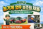 경남일간신문 | 합천군은 농기계대여은행 운영체계를 강화하고 농업인 영농 편의를 높이기 위해 2026년 농기계 업무보조원 기간제근로자 9명을 채용한다고 14일 밝혔다. 이번 채용은 기간제근로자의 처우 개선을 통해 안정적인 일자리를 제공하고, 이를 바탕으로 농기계대여은행 이용 농업인들의 영농 편의를 실질적으로 향상시키기 위한 정책의 일환으로 추진된다. 채용 인원은 9명(기술직 8명, 민원응대 1명)이며, 선발된 인원은 농기계대여은행에서 농기계 입·출고 관리, 배송 지원, 임대장비 유지·관리 및 기초 점검, 농기계 순회 안전(수리)교육 지원, 농업인 민원 응대 등 현장 밀착형 업무를 수행하게 된다. 특히 합천군은 업무 숙련도와 전문성을 보수에 반영하는 기술등급별 임금체계를 적용해(99,910원/일~150,100원/일, 복리후생 수당 30만원/월), 농기계 정비수리 실기평가 결과에 따라 차등 지급함으로써 능력과 책임에 상응하는 합리적인 보상체계를 마련했다. 이를 통해 근로자의 근무 안정성과 책임성을 높이고, 서비스 품질 향상으로 이어지는 선순환 구조를 만든다는 방침이다. 채용 대상자는 농기계 분야 및