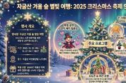 경남일간신문 | 의령 자굴산 자연휴양림은 오는 25일부터 27일까지 3일간 ‘자굴산 겨울 숲 별빛 여행’을 개최한다고 밝혔다. 이번 행사는 연말 가족 여행객과 휴양림 방문객을 위한 겨울맞이 특별 프로그램으로, 체험과 공연 등 남녀노소 모두 즐길 수 있는 다채로운 콘텐츠가 준비되어 있다. 특히 12월 중순부터는 노각센터 앞에 대형 화이트 트리가 설치돼 휴양림 전체가 크리스마스 분위기를 물씬 풍기며, 방문객들에게 더욱 특별한 겨울 정취를 선사할 전망이다. 행사는 자굴산 자연휴양림 노각센터 일원에서 진행되며, 프로그램은 시간대별로 자유롭게 참여할 수 있다. 대표 프로그램으로는 문양을 새겨 만드는 우드버닝 체험, 수제 쿠키 및 블록 트리 만들기, 달고나 체험, 유아를 위한 에어바운스 운영, 코믹 매직 벌룬쇼 등 다양한 체험과 공연이 펼쳐져 관람객에게 즐거움을 선사할 예정이다. 의령군 관계자는 “겨울 숲 속에서 가족과 함께 따뜻하고 특별한 시간을 보내실 수 있도록 알찬 프로그램을 준비했다”며 “연말을 맞아 자굴산 자연휴양림에서 행복한 추억을 만들어 보시길 바란다. 또한 자체 제작한 4계절 탁상달