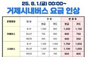 경남일간신문 | 경남 거제시는 오는 1일부터 시내·마을버스 요금을 최대 200원 인상한다. 이번 요금 조정은 2020년 1월 이후 5년 7개월만으로, 지난 6월 결정된 경상남도의 “시내·농어촌버스 운임·요율 기준”에 따라 거제시를 포함한 도내 전역에서 시행되는 것이다. 요금은 ▲일반(성인)은 시내버스, 좌석버스, 마을버스 각 200원 ▲청소년·어린이는 시내버스와 마을버스는 100원, 좌석버스는 150원이 오른다. 2000번 버스는 이번 요금 조정에서 제외된다. 이에 따라 현금 기준 시내버스는 일반 1,500원→1,700원, 청소년 1,000원→1,100원, 어린이 750원→850원으로, 좌석버스는 일반 1,600원→1,800원, 청소년·어린이 1,250원→1,400원으로 각각 인상된다. 마을버스는 일반 1,000원→1,200원, 청소년 700원→800원, 어린이 500원→600원으로 인상된다. 시 관계자는 “이번 인상은 2020년 1월 이후 5년 7개월 만의 요금 조정으로 인건비, 유류비 등 운송원가 상승에 따른 버스업체의 운영 적자 등을 고려하여 불가피하게 결정된 것으로 시민 여러분의