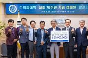 경남일간신문 | 진주 동명고등학교를 졸업한 수의사들로 구성된 ‘동수회’(회장 김도경 동명대학교 반려동물대학 학장)가 경상국립대학교 수의과대학 설립 70주년 기념행사 후원을 위해 발전기금을 출연했다. 발전기금 전달식은 9월 19일 오후 3시 대학본부 3층 접견실에서 열렸다. 이번에 전달한 발전기금은 동수회 소속 회원들이 뜻을 모아 마련한 2000만 원으로, 수의과대학 설립 70주년 기념사업의 원활한 진행과 후학 양성을 위한 행사 지원에 사용될 예정이다. 이로써 현재까지 수의과대학 설립 70주년 기념행사 후원금은 총 6120만 원에 달한다. ‘동수회’는 진주 동명고등학교를 졸업한 수의사 약 70명으로 구성된 단체로, 2000년 결성 이후 현재까지 활발한 교류와 친목을 이어오며 수의학 발전과 고향 후배들을 위해 꾸준히 뜻을 모아 왔다. 이번 발전기금 출연은 “경상국립대학교 수의과대학의 역사와 전통을 축하하고, 고향의 대학과 후배들의 발전에 작은 보탬이 되고 싶다.”라는 회원들의 뜻을 반영한 것이다. 이날 행사에는 권진회 총장을 비롯해 이성갑 교학부총장, 김봉조 기획처장, 김경수 국제협력부처장, 수의과대학 김상현 학장
