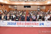 경남일간신문 | 진주시는 20일 진주시청 2층 시민홀에서‘2025년 장애인식개선 교육’을 실시했다. 이번 행사에는 관련 공무원, 무장애도시 읍면동위원 등 200여 명이 참석한 가운데 장애에 대한 사회적 편견을 해소하고, 장애인과 비장애인이 함께 어우러지는 포용사회를 만들기 위한 취지에서 마련됐다. 특히 이번 교육은 장애유형 중에서도 정신장애에 대한 시민의 인식 부족과 사회적 낙인이 여전히 깊게 남아 있는 현실을 반영해, 가장 낮은 이해도와 높은 편견 수준을 지닌 정신장애에 대한 올바른 정보를 전달하고 사회적 수용성을 높이기 위해 기획됐다. 창신대학교 사회복지학과 이진향 교수를 초청해‘정신장애인의 특성 및 이해’라는 주제로 정신장애인의 주요 특성, 증상에 대한 이해, 사회 적응과 회복 과정 등에 대해 체계적으로 설명했다. 또한 부대행사로 시민홀 내·외부에서 중증장애인생산품으로 지정된 발달장애인 그림 렌탈을 통한 전시회도 함께 개최했다. 전시는 발달장애인 김윤재 외 8명 작가들의 창의성과 감성이 담긴 그림 작품 64점이 전시되어 그림을 통한 발달장애인에 대한 이해를 높이는 계기가 됐다. 발달장애인 그림